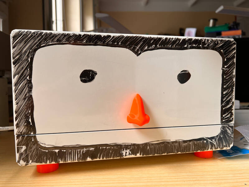 Podejście to wdrożył w życie nasz dyplomant, p. Robert Jesionowski. Surową, białą obudowę kilkoma prostymi operacjami zamienił w miłego kompana, który wyglądem ma przypominać pingwina. Tym samym udało się połączyć sympatyczną powierzchowność z funkcjonalnością pozwalającą rejestrować w niej charakterystyki prąd-napięcie, z wykonywanych w ramach pracy magisterskiej nanostruktur FEBID-owych, jakimi są platynowo-węglowe Pt/C. Niniejsze badania mają dostarczyć informacji na temat mechanizmu transportu ładunku w nanodrutach.